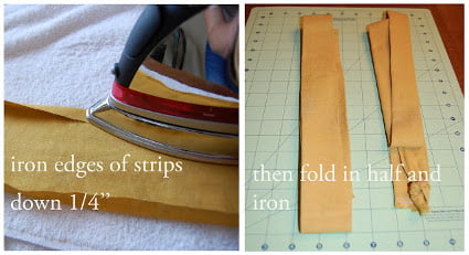 - Comienza planchando los bordes de cada tira hacia dentro, luego dobla por la mitad y plancha de nuevo.