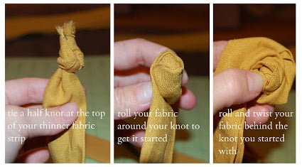 - Toma la tira de tela más delgada y has un nudo en la punta. Comienza a enrollar la tela alrededor del nudo, girando cada vez la tira de tela detrás del nudo.