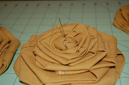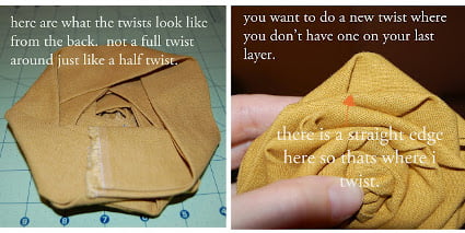 - Sigue enrollando la tira de tela, que lucirá por la parte de atrás como te muestra la fotografía. Tuerce la tela para crear nuevos pliegues y picos que formarán los pétalos de estas flores. Una vez hayas terminado con la tira más delgada, asegura la flor con pinzas y repite el proceso de enrollar y girar la tira más gruesa, completando la flor y haciéndola más grande. Asegura con alfileres.