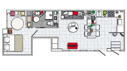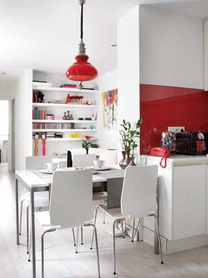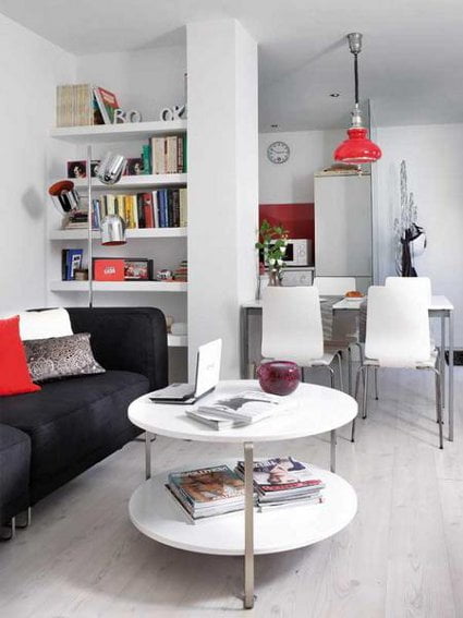 La mejor distribución para los pisos pequeños es la de plano abierto, en la que se combinan salón, cocina y comedor. La ausencia de muros da la sensación de espacio y libertad, mientras que los muebles y alfombras sirven para delimitar cada espacio. Fíjate en la gran profusión de espacio de almacenamiento: estanterías y armarios permitirán que cada cosa tenga su lugar, evitando el desorden y la sensación de abarrotamiento.