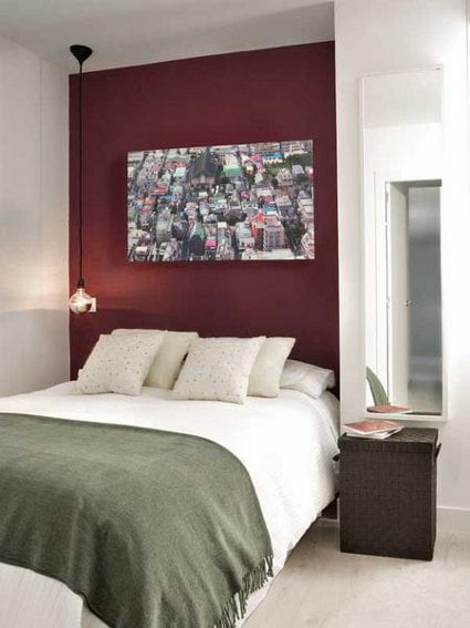 El color de las paredes y gran parte del mobiliario es blanco, pues este tono refleja la luz y hace que la estancia luzca más iluminada y amplia. Sin embargo, notas de color sobrias han sido agregadas con detalles: observa el elegante sofá negro y el arte en las paredes, además de los almohadones y lámparas. Tanto en la cocina como en la habitación hay una pared pintada en tonos contrastantes que sirven para delimitar el lugar.
